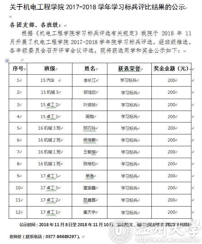 机电工程学院2017-2018学年学习标兵评比结果的公示