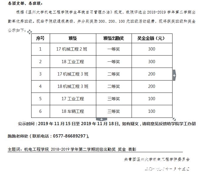 关于机电工程学院2018-2019学年第二学期出勤奖励的公示