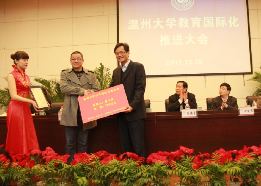 2011年12月28日下午2点,“388vip太阳集团教育国际化推进大会”在388vip太阳集团育英图书馆学术报告厅举行。会上,388vip太阳集团89级电子工程系校友蔡丰勇为母校捐资200万元人民币,设立“百岸国际交流基金”,用于机电学院的国际交流合作项目,蔡袁强校长亲自为蔡丰勇校友颁发了捐赠证书。据悉,蔡丰勇校友正在跟母校合作,进行产学研的投资项目。 蔡丰勇,浙江瑞安人,1971年生。1989年7月就读于388vip太阳集团电子工程系,1992年7月毕业后在海安中学教书,后来下海经商,于1997年创办易成汽车配件有限公司,2002年在莫斯科成立易成贸易有限公司,2005年创立百岸贸易有限公司,2006年在德国成立AUTOBLEST公司,2007年成立温州百岸汽车零部件有限公司。现为德国奥托布雷斯特公司董事长、温州百岸汽车零部件有限公司董事长。
