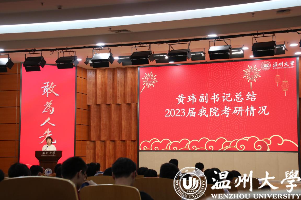 会议伊始,我院党委副书记黄玮老师对2023年学院的考研情况进行总结。我院考研升学率连续两年突破40%,离不开升学办公室教师团队、学工办辅导员团队、班主任们的全心付出,总结了一年来我院开展的二十余项考研帮扶活动。肯定了机电学子们近一年备考的努力和付出,学霸宿舍、退伍大学生、考研搭子等榜样的力量,振奋人心,他们的成功经验为学弟学妹们起到了示范性作用。同时,表达了对上岸学子们的殷殷祝福,希望他们能在追梦路上,将“求学问是、敢为人先”的校训融入日常生活中,在担当中历练、在尽责中成长。