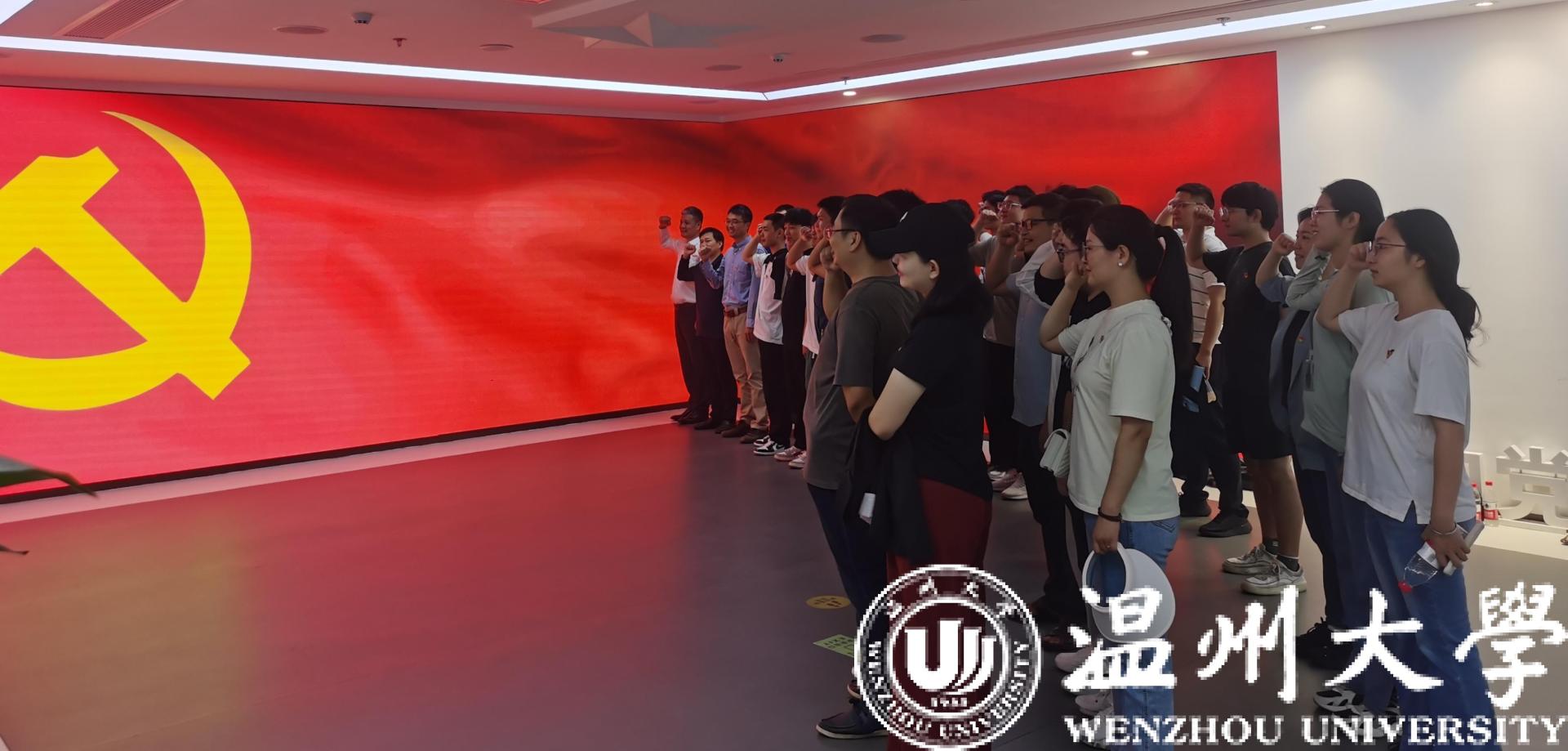 在三垟湿地“瓯江红”党建人才综合体党史教育馆内,师生党员面向党旗举起右拳、庄严宣誓,重温入党誓词,再一次体会到了共产党员的责任感和使命感。
