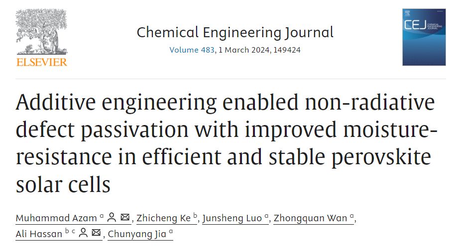 近期,我院激光加工机器人国际科技合作基地Ali Hassan博士(共同通讯作者)与电子科技大学集成电路科学与工程学院贾春阳教授等合作,在学术期刊《Chemical Engineering Journal》(IF 15.1)上发表题为“Additive engineering enabled non-radiative defect passivation with improved moisture-resistance in efficient and stable perovskite solar cells”的研究论文。
