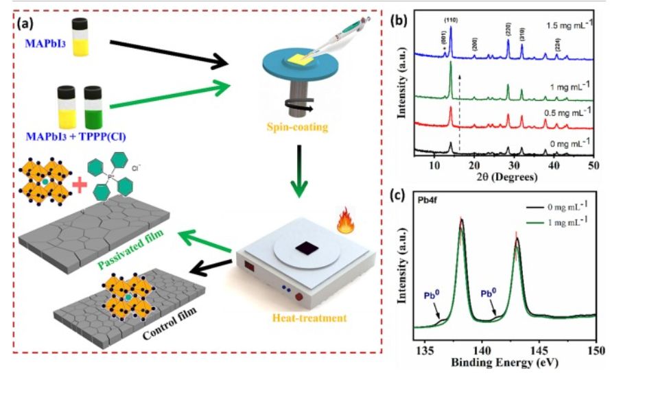 本研究阐明了四苯基氯化磷(TPPP(Cl))络合物作为添加剂在CH3NH3PbI3钙钛矿中的作用—表面钝化,以及卤化物空位和不协调的Pb相关缺陷(这些缺陷限制了高效和稳定的PSCs的制备)钝化。TPPP(Cl)是一种含有卟啉环结构的络合物,具有与金属离子配位的能力。此外,在钙钛矿薄膜的制备中加入优化浓度后的TPPP(Cl),能为材料提供更高的结晶度、更大的晶粒以及更低的缺陷密度,同时也提高了MAPbI3薄膜中光生电荷的载流子寿命。通过优化添加比,基于MAPbI3 平面器件的PCE从16.9%大幅提高到20.2%,同时有效地减少了器件光电流滞后现象的发生。此外,TPPP(Cl)作为添加剂还能提高器件的抗湿性,使得其在环境中储存30天后,仍然能达到初始PCE的89%,从而延长了器件的稳定性。这些结果表明了TPPP(Cl)作为钙钛矿前驱体添加剂对提高制备的PSCs效率和稳定性的重要性。