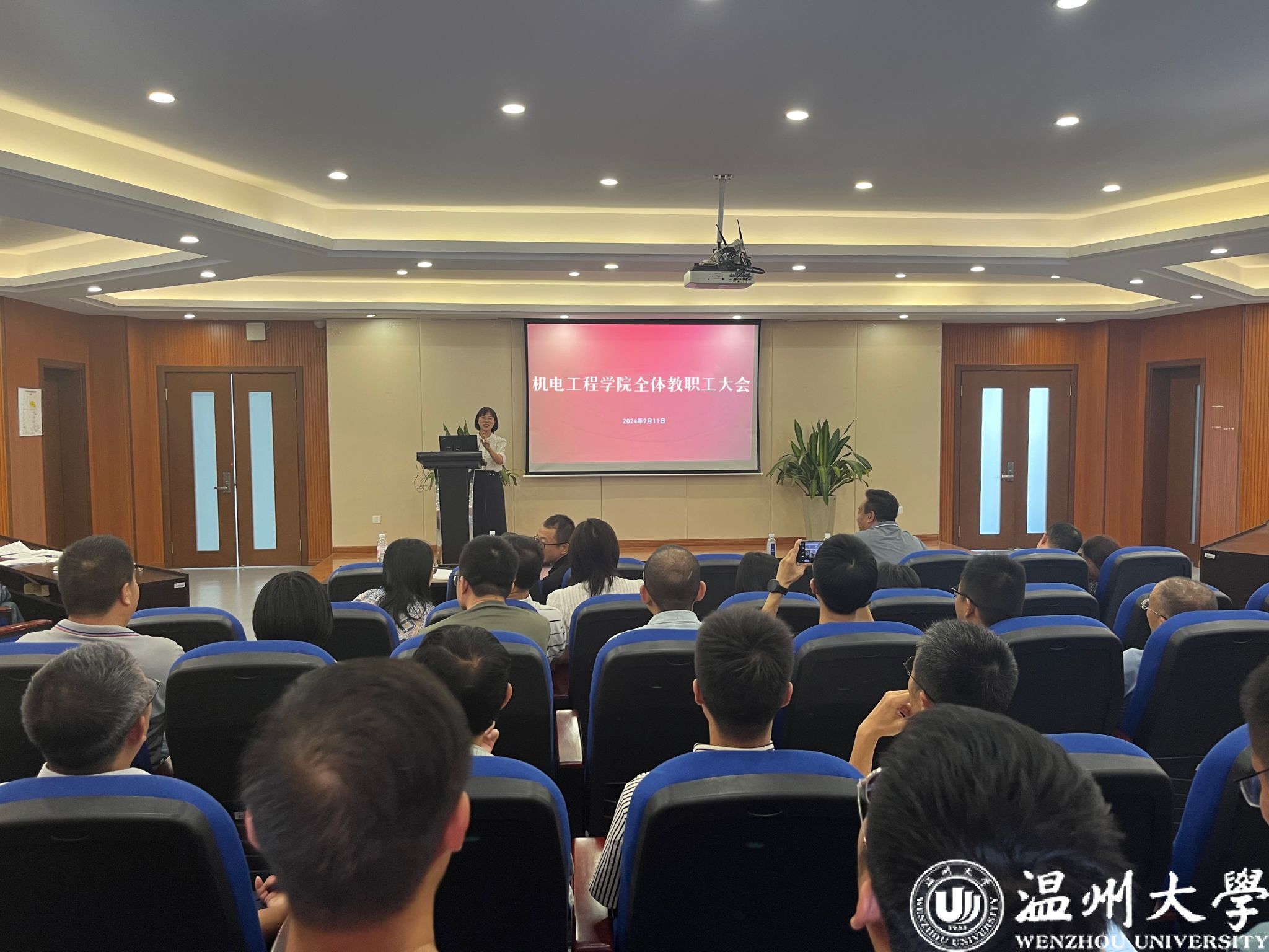 9月11日下午,新学期伊始,388vip太阳集团机电工程学院全体教工大会在B309会议室召开。院长向家伟、党委书记易招娣、副院长朱德华以及机电学院全体教职工参加,会议邀请审计处处长陈小敏、瑞安研究生学院执行院长吴明格参加并做党纪学习教育、瑞安研究生学院工作谋划专题分享。