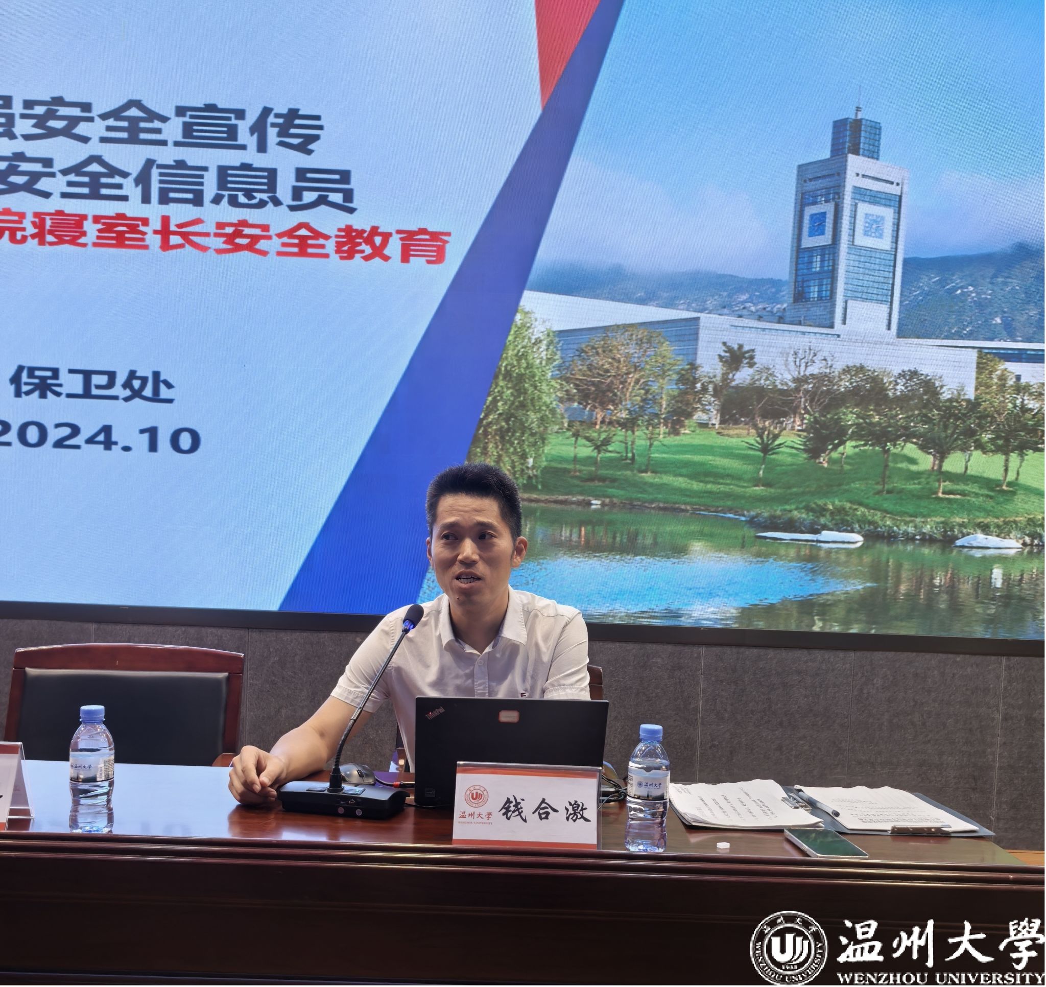第二项,方建晓老师分享学生安全工作经验。首先,建议大家要将寝室当成自己家,处理好同学之间关系,珍惜寝室室友间友谊,做有格局的寝室长。其次,肯定今晚同学现场认真听讲的精气神,也提醒大家增强非判断力,避免网络负面新闻与恶意造谣行为。最后,告诫各位同学将校园安全放在第一位的同时,也要注重专业学习、保证个人在温大的成长。