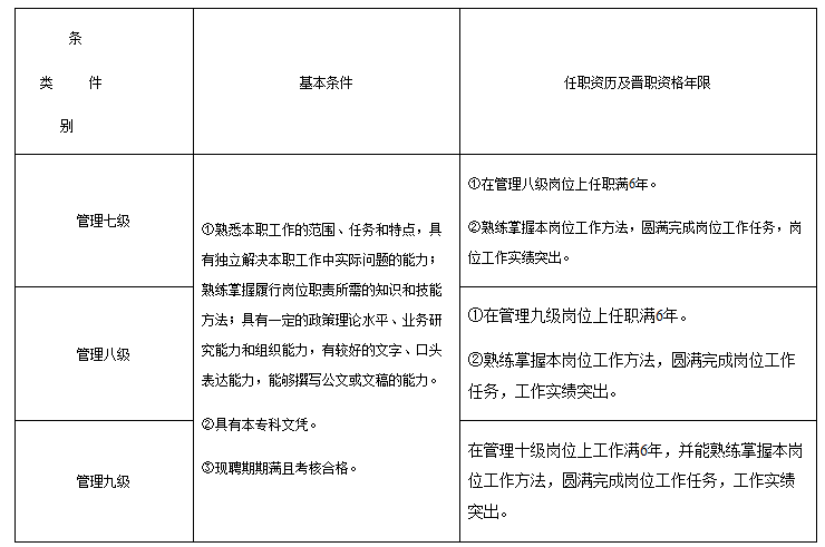 各学院、各部门: 为加强管理队伍建设,充分调动教职工的积极性,根据《关于事业单位岗位管理制度实施后有关问题的意见》(浙人社发〔2013〕106号)、《关于事业单位管理岗位部分职员等级晋升问题有关事项的通知》(浙人社办发〔2013〕53号)、《关于事业单位岗位管理制度实施后有关问题的处理意见》(温人社发〔2015〕280号)、《388vip太阳集团岗位设置实施方案(试行)》(行政〔2011〕79号)等文件精神和要求,结合学校岗位实际情况以及第三轮国聘工作,经研究,决定开展部分管理岗位职员职级竞聘晋升试点工作。现将有关事项通知如下: 一、评聘和转岗原则 1.在上级部门核定岗位数内,根据学校实际情况和事业发展需要设置岗位。 2.按照岗位管理有关规定程序进行,择优评聘。 二、申报对象 1.管理职员评聘的申报对象:现聘管理岗位的工作人员。本次管理岗位职员制的试点工作,仅针对管理岗位职级的九级、八级和七级进行。 2.转聘管理岗位的申报对象:在行政管理岗位上工作的专技、工勤人员,经过个人申请可以转岗至管理岗位。 在管理岗位上工作的专技、工勤人员需要首先进行转岗,然后才能参与后续的职员制竞聘。在管理岗位上工作的专技九级、十级人员可以申请转岗为管理八级;专技八级可以转岗为七级。在管理岗位上工作的、具有大专文凭的工勤人员,高级技工可以申请转岗管理九级;中、初级可以申请转岗为管理十级。 三、申报条件 1.坚持和拥护党的基本路线,贯彻党的各项方针政策;遵纪守法,廉洁奉公,作风正派,讲团结,以集体利益为重。 2.有较强的事业心、责任心,工作做出实绩。 3.本轮国聘聘期期满且考核合格的工作人员。 4.各级岗位竞聘基本条件、任职资历及晋职年限如下: 附 表 职员职级申报条件明细表