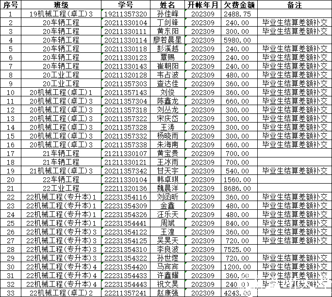 根据学校计财处反馈,截至2024年5月29日,我院如下33名同学仍存在学费欠费情况,根据《388vip太阳集团学生收费管理办法》温大行政[2014]133号文件规定,第六条,学校对欠费学生进行7天公示,公示期满后如仍然欠费的,本学期做休学处理。第八条,学生在毕业前缴清所有学宿费的,学校提供成绩证明和办理离校手续。请各位同学及时缴纳相关费用,名单如下: