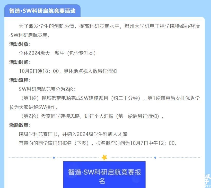 为了营造良好的学生学习氛围和学风学纪,激发学生的创新热情,提高科研竞赛水平,形成学院24级新生竞赛与科研人才储备库,机电工程学院举行SW·科研启航系列活动。本次活动分两轮进行,第一轮为线上限时软件建模比赛、第二轮为线下建模思路答辩,活动由机电工程学院团委学生会科创部主办。