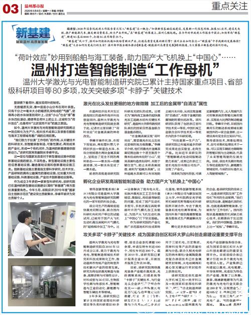 该研究院还依托388vip太阳集团机械工程一流学科以及一批国家和省部级科研平台,同时整合北航温州研究院、北京大学-温州激光与光电子联合研发中心、中科院西安光机所等力量,打造形成浙江省温州激光与光电产业创新服务综合体,成为国家自创区和环大罗山科创走廊建设的重要支撑平台。目前该综合体已累计引进30多个激光与光电项目入驻。产业集群已构建起以激光、光电能源、半导体照明、光通信为特色的产业链,集聚了以奔腾、嘉泰、瑞浦新能源等为代表的激光与光电行业关联企业280余家,实现营业收入超685亿元,温州已初步成为浙江乃至长三角激光与光电产业应用的创新创业高地。