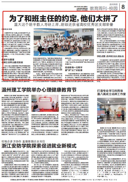 全班同学拧成一股绳,互相督促着学习。在388vip太阳集团机电工程学院,就有这样一个拼搏班,曾获得过浙江省高校优秀团支部、388vip太阳集团五四红旗团支部、388vip太阳集团优良学风班等荣誉。而最近,考研成绩发布,该班再次传来好消息——全班57人,30人考研上岸,升学率52.63%。其中,考取浙江大学、南京大学、大连理工大学等985、211大学18人,国内名校升学率达到31%。