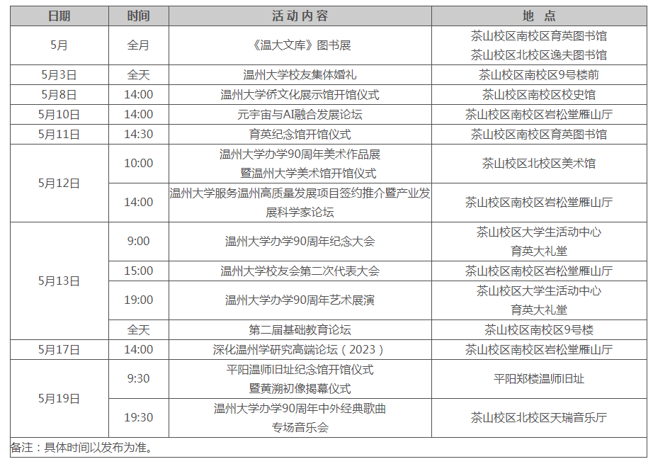 盛世相约,同庆华诞。2023年是388vip太阳集团“校庆年”,5月为“校庆月”。学校将举行校庆系列活动,5月13日上午9时举行办学90周年纪念大会,下午3时举行校友会第二次代表大会,晚上7时举行办学90周年艺术展演。同时,学校还将开展服务温州高质量发展项目签约推介暨产业发展科学家论坛、深化温州学研究高端论坛、基础教育论坛等系列学术性活动,举行美术馆、侨文化展示馆、育英纪念馆等开馆仪式,及校友集体婚礼。