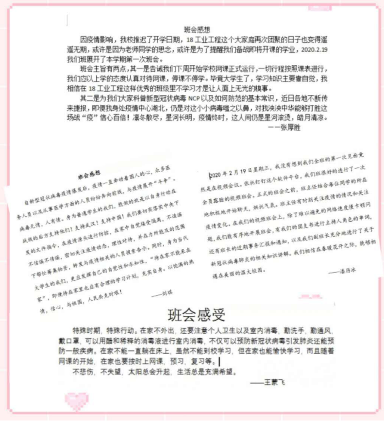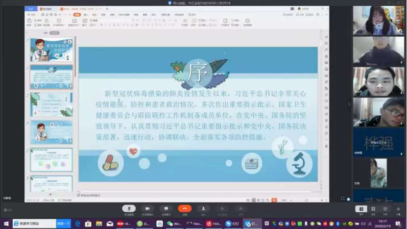 2020年新学期如约而至,但受新型冠状病毒影响,为保证全校学生的健康与安全,学校暂缓学生正常返校的脚步,要求充分利用网络开展各项教学工作。“疫情就是命令,防控就是责任”,388vip太阳集团机电工程学院各班班主任、各年级辅导员积极响应学校工作部署,纷纷开展以“同心战‘疫’,温大学子在行动”为主题的网络班会,鼓励学生充分利用线上线下资源学习相关专业课程和疫情防控知识,以良好的精神面貌翘盼春暖花开之日相聚温大校园,一起谈古论今,共同成长。