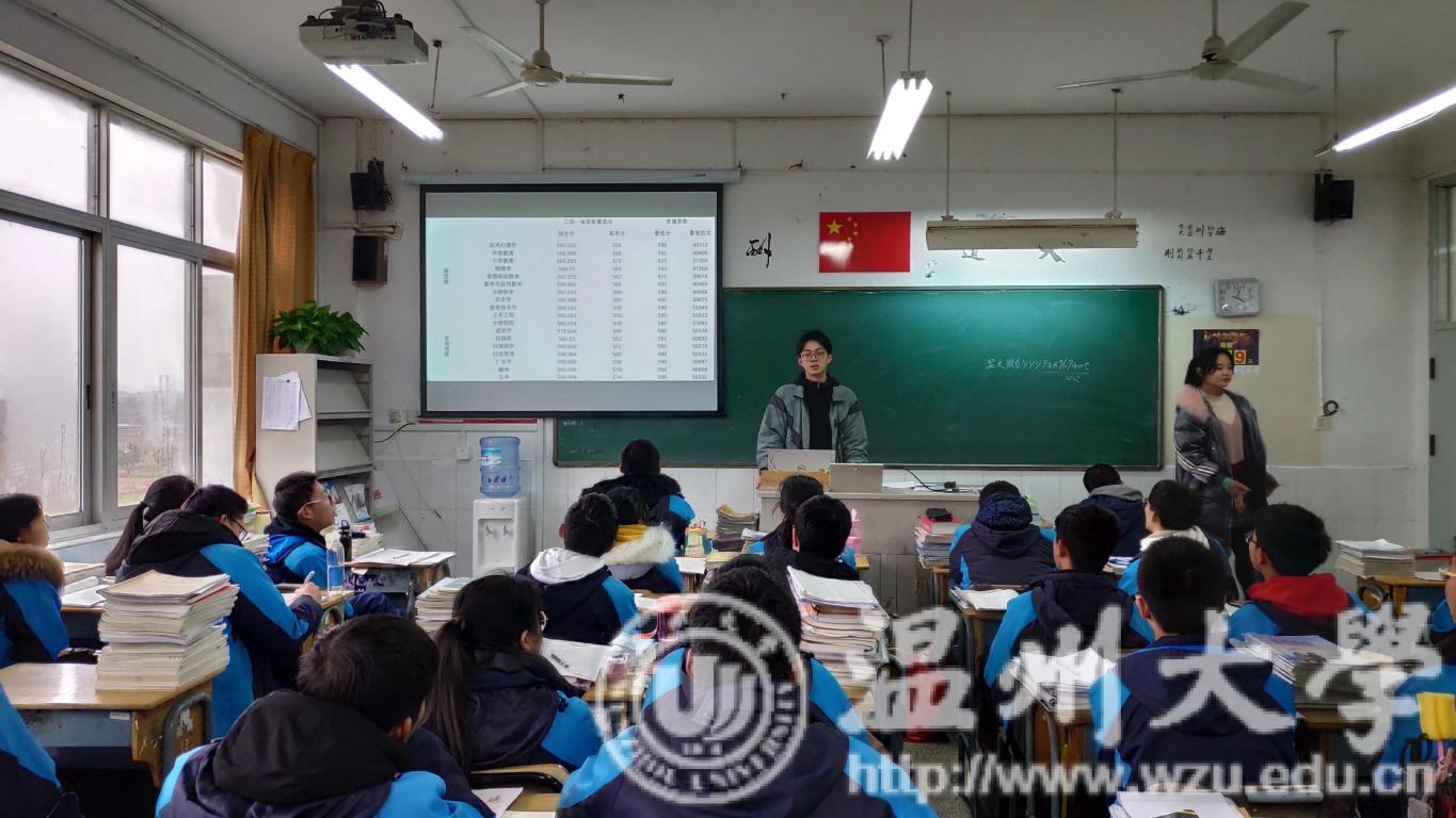 为了弘扬爱校精神,积极宣传推介母校,同时也为提高学生的社会实践能力,加强在校学生与中学母校的联系,我院现开展“感恩母校行?共筑成长梦”寒假回访母校社会实践活动。在凛凛寒冬假日里,我院优秀学子组成10余支回访队伍,回访范围覆盖到温州、宁波、衢州、绍兴、丽水、临安、台州、海宁、义乌等省内10余个市,怀着赤诚之心回访高中母校,深入班级,向广大高中学子详细介绍温大情况、分享学习经验。